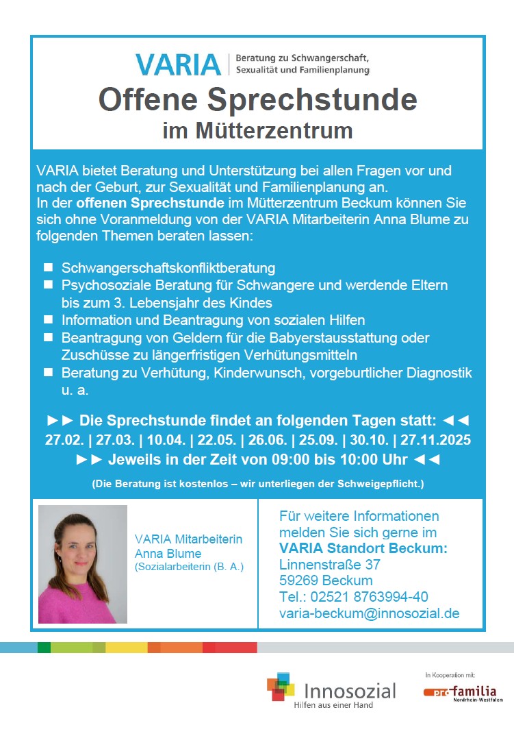 In der offenen Sprechstunde im Mütterzentrum Beckum können Sie sich ohne Voranmeldung von der VARIA Mitarbeiterin Anna Blume zu folgenden Themen beraten lassen: